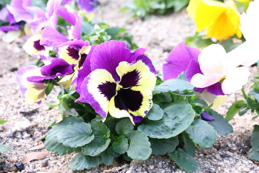 スミレ科スミレ属の一年草。冬を代表する花の一つで耐寒性が強く開花期も10月頃から4月頃までと期間が長いため非常に扱いやすい。品種や花色も多くブロッチという中央に模様の入ったものもある。原産はヨーロッパに自生していた野生種。品種改良も進み多くの品種が存在する。パンジーという名称が主流だが、遊蝶花や胡蝶花という呼び方もある。洒落てて好き。サイズが小さいものはビオラ。